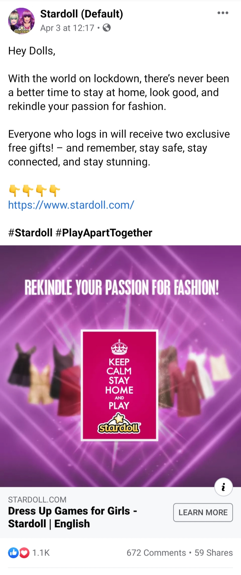 Social media posts vary and are determined by the platform. Our Instagram’s focus is heavier on fashion while Facebook’s focus has been on new item releases and highlighting winners of contests.